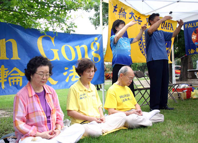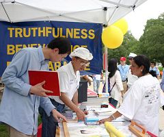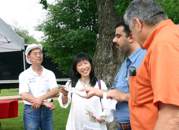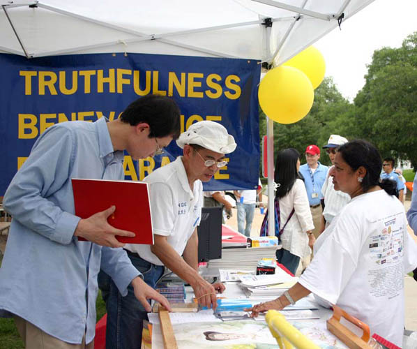 休士顿虽是初夏,仍凉风习习,气候宜人。市民源源不断而来,兴致勃勃的游览。在众多的展位中,法轮功展位格外给人清新之感。一法轮功学员向附近展位女工作人员介绍“今日法轮功”报纸上揭露中共活体摘取法轮功学员器官的资料,这位女士听了大吃一惊,着急的问:“这在哪里发生?”学员回答:“在中国”,这女士紧张的又问:“什么时候?”学员回答:“现在。”这女士面色沉重,说:“太残忍!”
