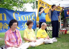 法轮功学员非常重视这次讲真相的机会,学员来的早,精心布置展位。展位正面及侧面都有中英文“真、善、忍”的横幅,桌上有中英文的大法书籍及教功光碟、中英文的真相资料,如英文Falun Gong Today(“今日法轮功”)报纸、中英文《九评共产党》报纸、“真、善、忍画展”作品,电视机也在不停的播放五套功法教功带。“今日法轮功”报纸上揭露中共活体摘取法轮功学员器官的资料格外令人震惊。