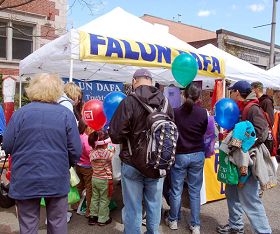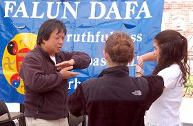 ![]() 渴望得知真相的人们纷纷来到法轮功摊位前 |