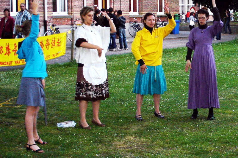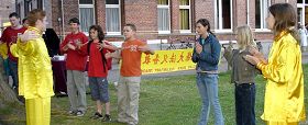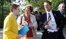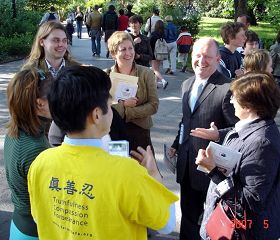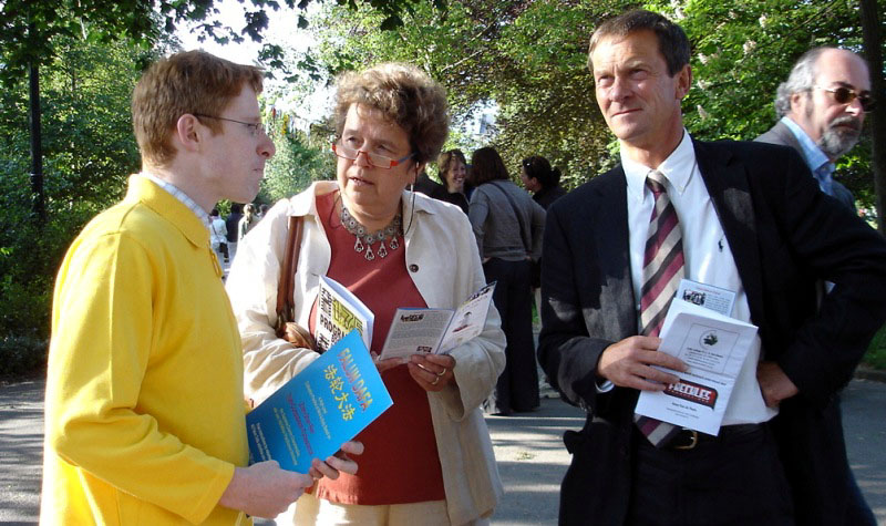 一对夫妇向学员打听在哪能学习法轮功?一位女士询问能否在本市学习功法?一位男士更急于知道怎样能了解更多的关于中共迫害法轮功的信息等等问题,学员们为人们一一解答。