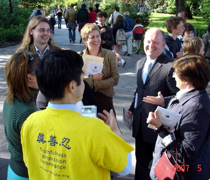 爱可罗市的市长及一些市政官员也参加了活动,市长克恩•卢特先生(Koen Loete)一行观看了法轮功学员的功法演示后表示了极大的兴趣,他询问:法轮功是如何使人身体得到健康的?看起来如此美好祥和的功法每次需要做多长时间等等。在他知道可以根据情况自己掌握时,他有信心的说:我需要一个半小时就可以放松了。他为自己的自信笑了起来。对中共残酷迫害法轮功的暴行他感到震惊,表示“一个对自己人民如此暴虐的政权必将灭亡!”最后市长诚恳的邀请法轮功学员到市政厅教功,届时他一定参加!