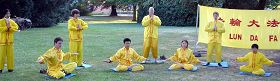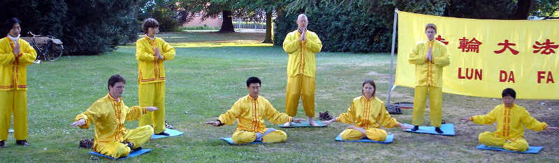 法轮功团体的场地设在校园的绿色草坪上,一眼望去“法轮大法-FA LUN DA FA”几个红字镶嵌在金黄色的横幅上十分醒目。闭路电视的大屏幕上放映着五套功法,法轮功学员向络绎不绝的人们讲解和散发着法轮功真相资料。