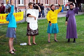 活泼的孩子们兴奋的跑来跑去,但是总是有那么一些孩子要留下来站在演示功法的法轮功学员后面模仿着动作。