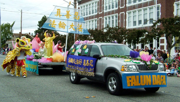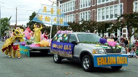队伍经过游行大道时,法轮功学员创作的中英文歌曲随着花车和舞狮表演在空中响起。两旁的观众中形成了一阵阵被法轮大法触及的波浪,观众的眼神注视过来,随之,掌声、欢呼声一片一片的响起。到处都听到人们赞叹说,看,多美啊!最美的花车!有的观众还向法轮功学员们合十敬礼。