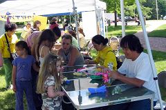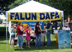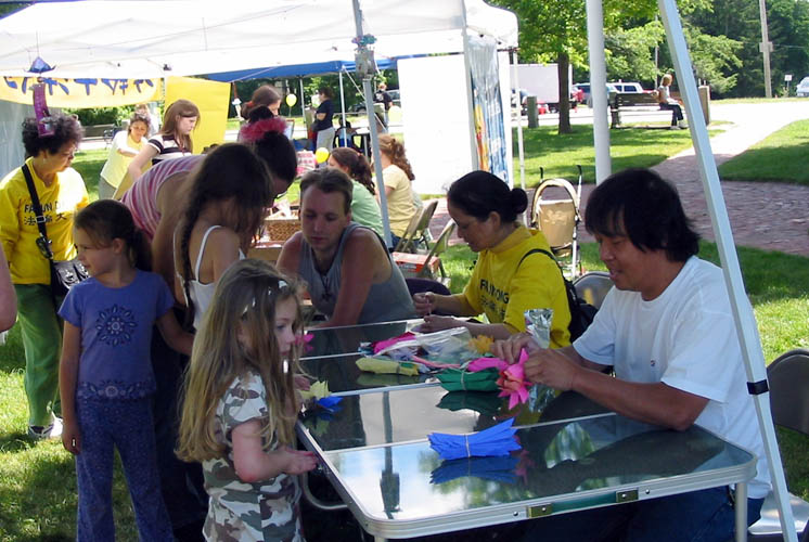 【明慧网二零零七年六月十三日】一年一度的东布里姬沃特艺术节(East Bridgewater Art Festival)活动于二零零七年六月十日在美国麻州东布里姬沃特市公园(East Bridgewater Common)举行。今年的艺术节主办单位除了展出了本地艺术家们创作的摄影作品和制作的手工艺品、歌舞表演等,又再次邀请法轮功学员教叠纸莲花并展示功法。