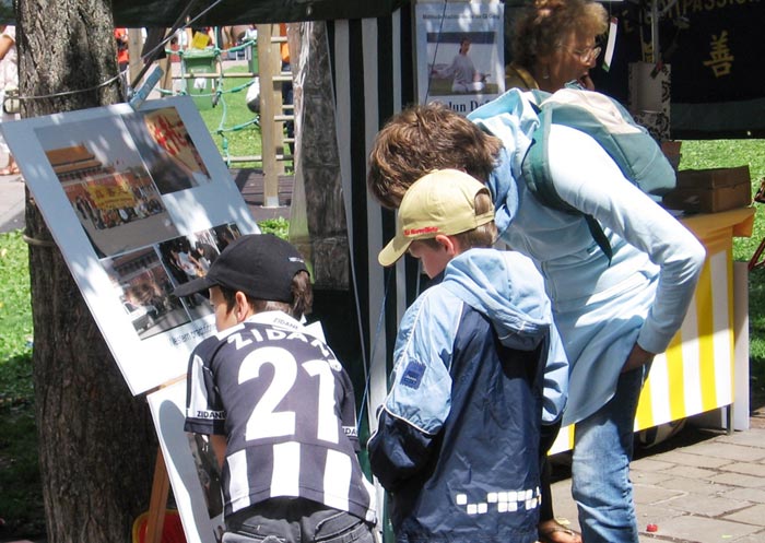 朴实、善良的人们普遍欣然接受大法真相材料,有的接到后就立即认真阅读,并主动签名表示对法轮功的支持。有的满怀兴趣的观看法轮功学员演示功法。有的认真的听取学员的介绍。有位年轻的母亲,主动在展板前向她的两个孩子介绍展板的内容,然后带着孩子签名反迫害。