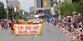 整个庆祝活动以盛大的游行开始。有几十个大大小小的乐队、几十辆花车和代表不同文化的各种表演队伍参加了游行。身穿各式古代、近代和现代军服的军乐队纷纷搬出拿手好戏,大小号齐鸣,鼓声震天。由多伦多法轮功学员组成的加拿大天国乐团和腰鼓队第一次出现在FIESTA周的游行行列中,让观众耳目一新,也让当地华人倍感亲切。观众们对法轮功学员的表演给予热烈的掌声鼓励。