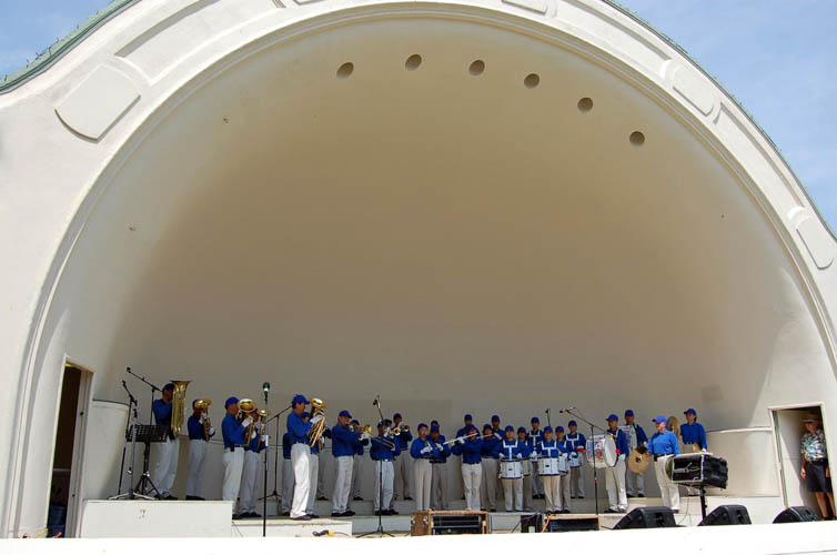 游行结束后,天国乐团在节日集会上,上台演奏了加拿大国歌《O,Canada》,《法轮大法好》、《法鼓法号震十方》等曲子,腰鼓队和舞狮队也出场表演精彩节目,吸引了在场的大小观众。