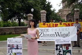 【明慧网二零零七年六月二十日】父亲节到了,对王晓丹而言,她的父亲节是空白的,给父亲的信或礼物是寄不到的。她的父亲被囚禁在远隔重洋的中国监狱里已经有八年了。但今年的父亲节不一样了,晓丹决定站出来,营救她的父亲。今天她站在美国德克萨斯州州政府的大楼前面举行了新闻发布会,踏出了营救父亲出狱的又一步。对晓丹而言,给父亲最好的礼物就是把父亲从黑牢中救出来,与她在海外团聚。