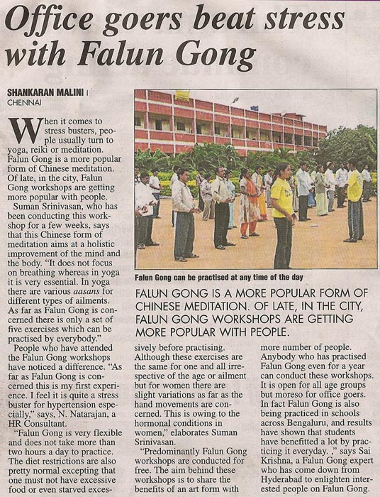 【明慧网二零零七年六月二十日】(明慧记者张颖编译报导)印度德干纪事报(Deccan Chronicle)六月十三日刊登文章说,当人们想缓解压力的时候,通常会借助于瑜伽,灵气自然疗法或打坐。法轮功是一项更受欢迎的中国静修功法。近来,法轮功的义务教功班越来越受欢迎。
