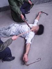 恶警还指使劳教人员将大法弟子李新建的手铐铐在扁担的两头上,劳教人员两人倒着班,手里拿着棍子不让他合眼(见模拟图2),一眨眼就捣下巴、敲前额,那声音就象卖豆腐的梆子,就这样一直20多天,李新建腿脚肿了,两手腕皮破肉烂,出脓出血,两手脚肿的象戴了拳击手套。这还不罢休,劳教所又调来武警协助残酷迫害坚定的大法学员,恶警将李新建剥光了衣服用十几根电棍, 电了整整两个半天8小时(见模拟图3)。李新建在2000年底,曾连续27天从早上6点到晚上10点遭受吊床、半飞酷刑的折磨,而晚上10点到早上6点再绑在扁担上不让睡觉。