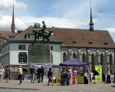 二零零七年六月二十三日,瑞士法轮功学员在苏黎世政府大楼前举办了讲真相、反迫害、传九评、促三退的洪法活动。