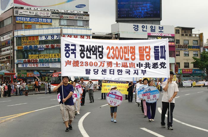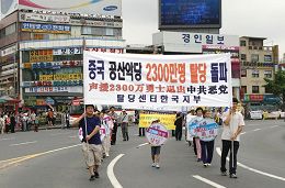 ![]() 6月24日,韩国退党服务中心在临近首尔的水原市举办了中国民众2300万三退声援集会和游行。发言者为水原退党服务中心代表曹宇铉(音) |