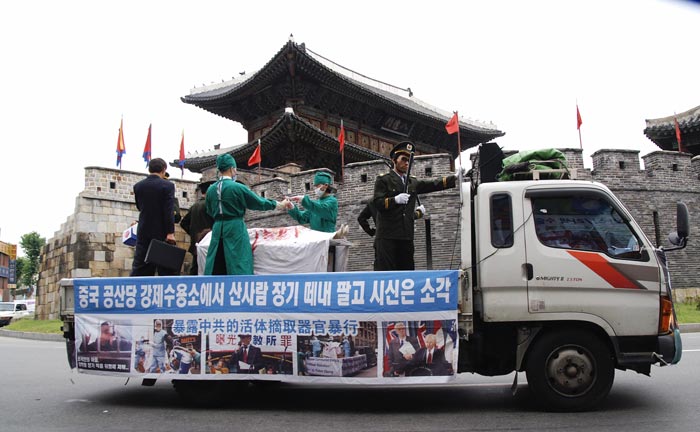![]() 游行中演示中共活体摘取法轮功学员器官的罪行 |