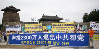 ![]() 6月24日,韩国退党服务中心在临近首尔的水原市举办了中国民众2300万三退声援集会和游行。背景建筑物为联合国教科文组织指定的世界文化遗产----水原华城 |