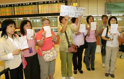 ![]() 台湾法轮功学员二十五日飞抵香港,但遭拒绝入境并被置留一夜。图为遭遣返的其中十二人。 |
