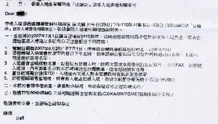 「香港入境事务处机场管制科指挥官陈孟麟于今日(二十五日)下午五时召集本公司紧急召开有关防堵「法轮功」旅客入境香港相关事宜。一、香港将于2007年7月1日庆祝香港回归10周年,法轮功信徒将列为不受欢迎旅客入境香港,要求台湾地区进入香港之各航空公司配合下列措施: