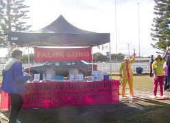 很多人在学员的摊位前停住脚步,用心观看。悠扬的炼功音乐及学员们的功法演示,吸引了人们的目光。学员热情的向观众派发资料,介绍法轮大法洪传全世界的盛况,以及在中国共产邪党如何残酷的迫害这些信仰真善忍的法轮大法修炼者。听到这些,人们震惊了,纷纷签名反对迫害。