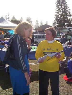 一名观众告诉学员,他非常喜欢法轮功,他在某市收容了十二个孩子,他回去准备教他们炼法轮功。一位观众说他看到附近路旁的“法轮功”广告牌就决定前来了解什么是法轮功。一位接到洪法传单的观众指着传单上联系人的电话号码说:“这是我目前要打的唯一的电话。”还有一位旁边摊位的姑娘对学员说:“我知道在中国中共迫害了许多基督徒,中共试图以武力镇压人民,只会适得其反,信仰法轮功的人会越来越多。”许多人表示他们知道二零零八年中国将举办“奥运会”,迫害法轮功是不符合奥运精神的。
