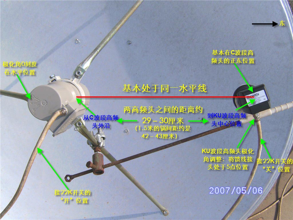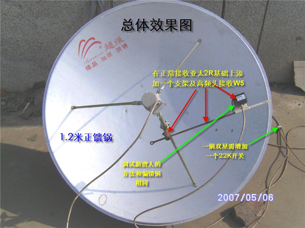 去年回家过年,突然萌发想看新唐人的新年晚会,于是马上行动起来,到市场上买了个45cm的小锅(45元),双本振高频头(35元),家里有一台诺普斯卫星接收机。