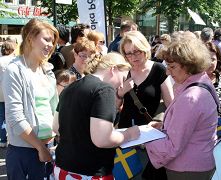 当天的游人中,还来了不少的中国人,他们大多都接了真相资料和《九评共产党》,表示要珍惜能出来的这次机会,回去一定要好好的看看,这在国内是不敢看的。有位文静的女士表示不能相信竟会有活摘器官这样的事发生,法轮功学员做了些介绍并准备了一些中文资料给她看。人群中走过来一对老夫妇,他们已经在瑞典居住二十多年了,他们说,对中共我们太了解它(的邪恶本质)了。为了表示对中共的强烈谴责,二位老人签上了他们的名字。有一个移民来自中国的中学生也签了名还高兴的拿了中文资料说要回去给爸爸妈妈看。