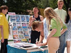 由于是周日,天气又特别好,所以来自乌克兰不同城市的游客都到这里来游玩。法轮功学员借此机会向来这里休息的民众揭露中共如何迫害信仰“真、善、忍”的法轮功学员,甚至活摘法轮功学员器官出售以牟取暴利。