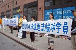 【明慧网二零零七年七月一日】(明慧记者采菊报道)二零零七年六月三十日下午,近百名纽约法轮功学员在中领馆前静坐,谴责中共恶行。过去数日来,中共胁迫港府大面积暴力遣返去香港的台湾法轮功学员,近日中领馆在纽约又利用海外学生网站对法轮功进行谩骂攻击。