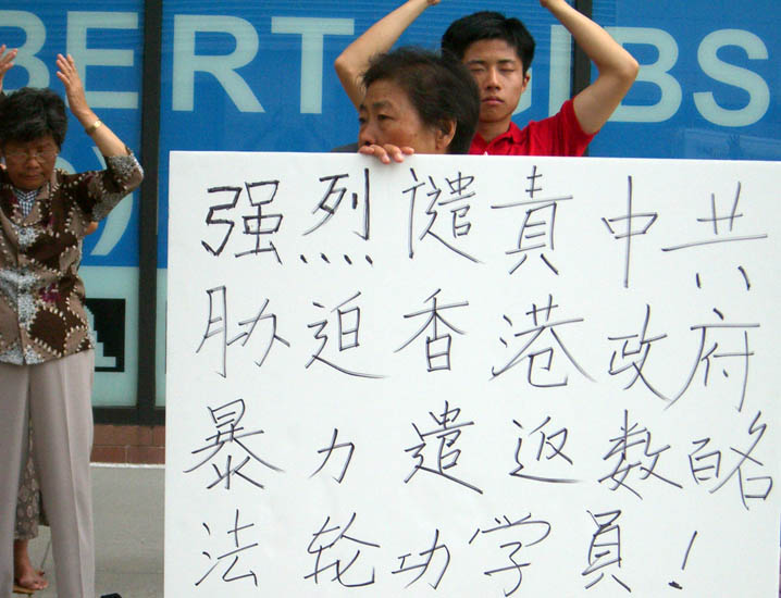 法轮功学员们在领馆前静静的炼功,中英文横幅“停止迫害法轮功”、“真善忍”和“严厉谴责中共胁迫港府暴力遣返法轮功学员”,告诉着来往的车辆和行人,中共对信仰“真善忍”的法轮功学员的邪恶迫害。