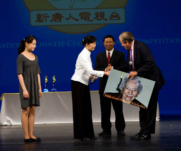 在七月八日下午的全世界中国舞大赛颁奖典礼上,约翰-布朗先生代表希尔德-葛尔斯特奖学金基金会向飞天舞蹈学校学生颁发了希尔德-葛尔斯特纪念奖学金(Hilde Gerst Memorial Scholarship)。感谢飞天舞蹈学校在弘扬人类正统文化中的启蒙和奉献精神。