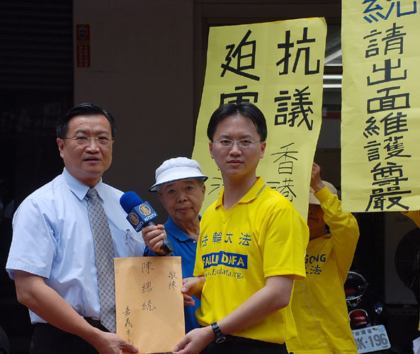 【明慧网二零零七年七月十日】为了谴责香港政府在“七一”前夕屈从中共、以暴力遣返合法入境的法轮功学员及民众,台湾嘉义法轮功学员于二零零七年七月七日向总统陈水扁呈递陈情书,由总统府秘书江志铭代表接受。江志铭表示感佩学员坚守正义的精神,将把陈情书转交陈总统。