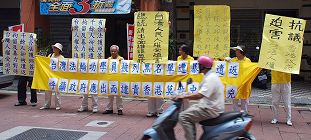 港府拒入境 法轮功学员在嘉义市街道举横幅讲真相