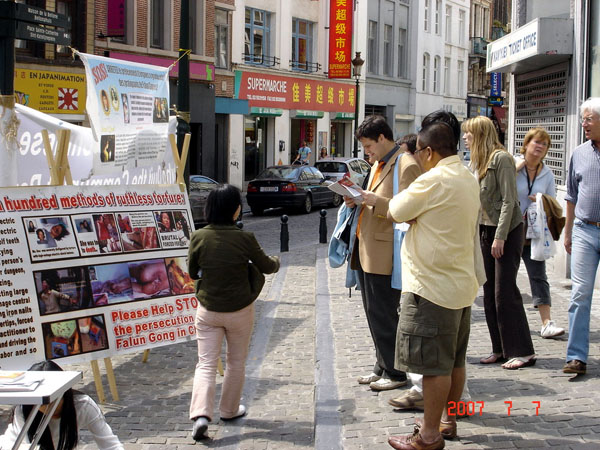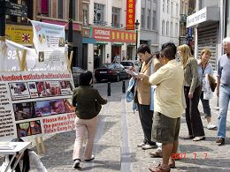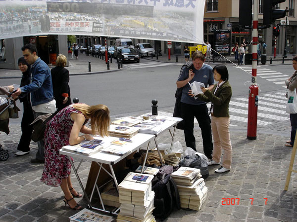 有位已旅居比利时几十年的华侨特意赶来索取大纪元报纸,并对活动举办者表示由衷的敬佩。两位从广东来旅游的看似政府官员的男士,过来观看声援退党的横幅以及揭露中共迫害法轮功的图片说明。在听了义工们的介绍后,他们表示感谢,并拿了资料回去看。