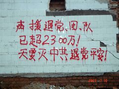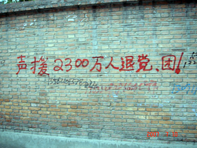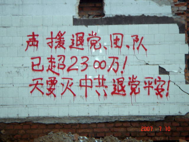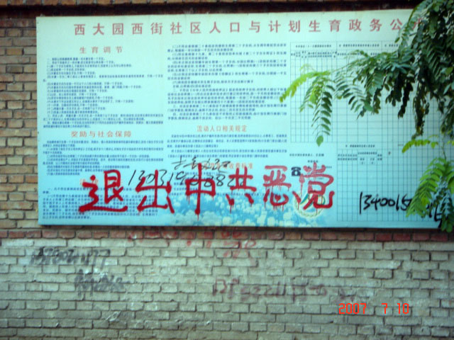 ![]() 保定市某小巷出现的退党标语 | ![]() 保定市某菜市场附近出现的退党标语 |