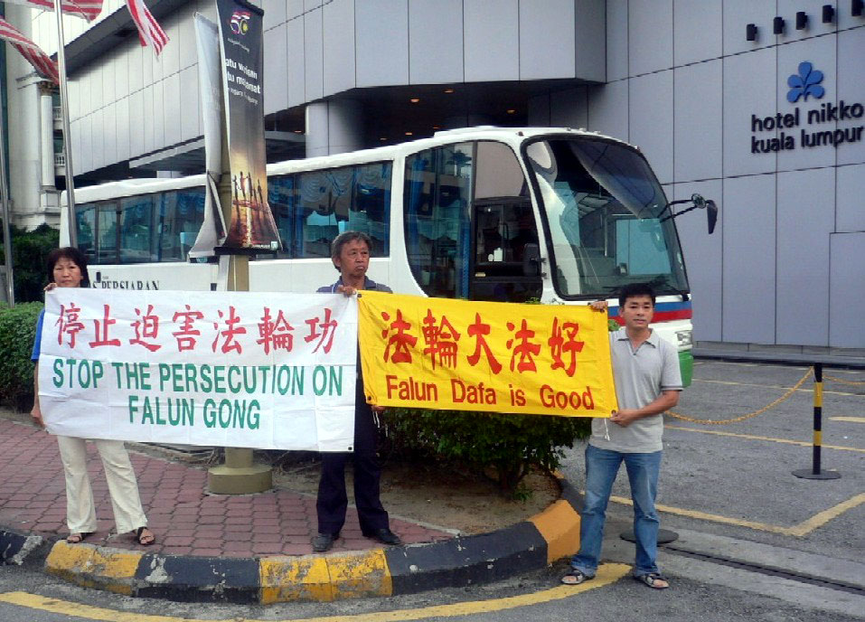 【明慧网二零零七年七月十五日】二零零七年七月十三日起,人权恶棍薄熙来访问马来西亚。马来西亚法轮功学员于七月十四日傍晚在薄熙来和中共驻马大使程永华等举行晚宴的酒店外抗议薄熙来迫害法轮功的暴行。