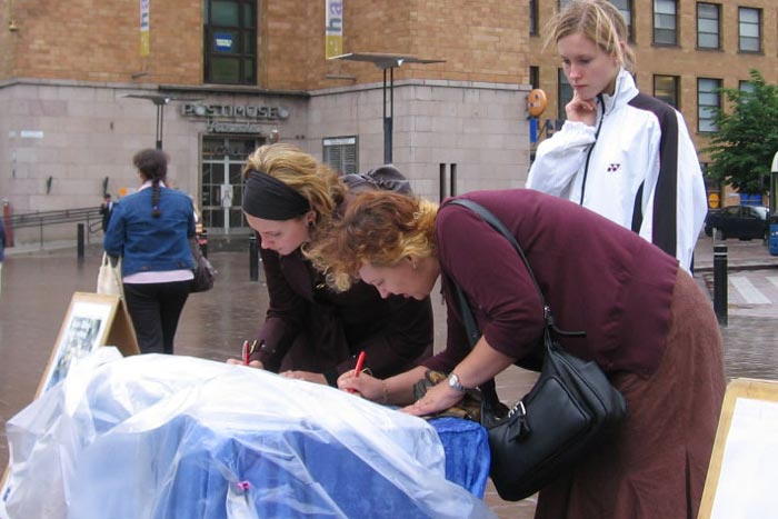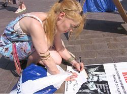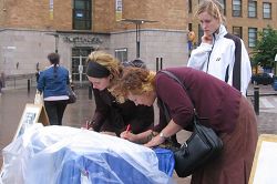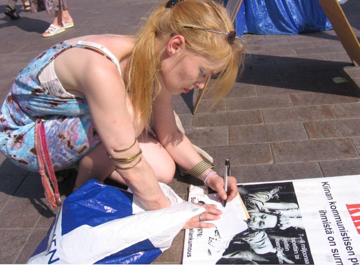 ![]() 这位芬兰姑娘在认真抄写退党横幅上的标语。 |
