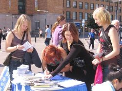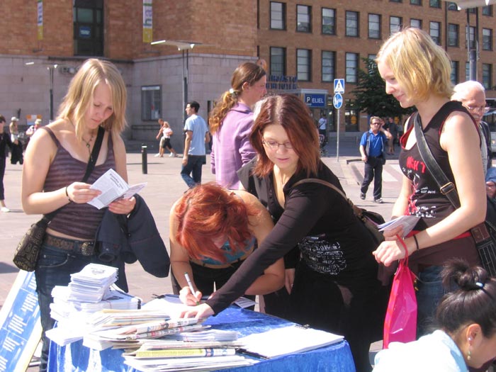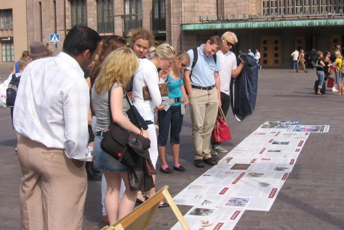 【明慧网二零零七年七月十六日】自从在二零零七年七月定为全球退党月,芬兰退党服务中心的义工和部份法轮功学员继月初的两次活动后,从七月九号(周一)到十四号(周六),顶着烈日或阴雨,在该市人流量最大的赫尔辛基火车站旁,持续揭露中共八年来残暴迫害法轮功及中共暴政虐杀八千万中国人民的罪行,声援三退大潮。