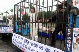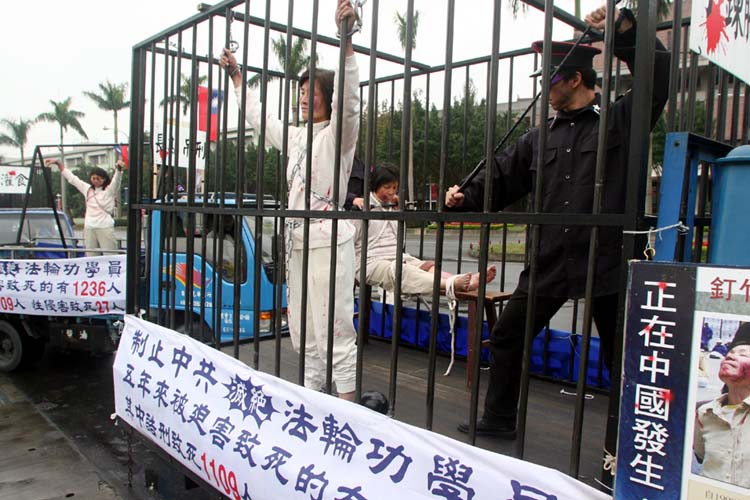 中共与江氏集团长期对法轮功学员施用电棍、关地牢、水牢、野蛮灌食、灌浓盐水、灌粪便、长期剥夺睡眠、性虐待、老虎凳等一百多种酷刑。为了让更多台湾民众了解法轮功真相及制止发生在中国大陆的残酷迫害,二零零四年起法轮功学员陆续在台北、新竹、台中、南投、嘉义、台南、高雄等地举办记者会、反迫害真人模拟酷刑展、图片展的车队游行。