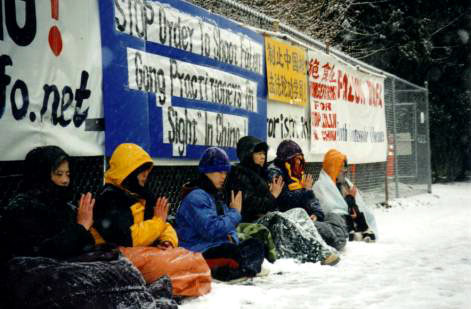 温哥华二零零一年的冬天,下着大雪,法轮功学员身上披着薄薄的简易塑料雨衣,坐在雪地里。抗议者之一张秀莲回忆说:“那天雪很大,身体周围的雪慢慢化成雪水,人就泡在雪水里。从早上坐到傍晚,冰水浸透全身,我在冰水中整整泡了十几个小时。”