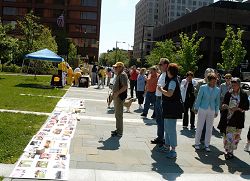八年了!多少个周末,这些法轮功学员不顾一周工作的劳累,自愿来到自由钟,向成千上万的游客讲述着法轮功真相,传递着同一个声音--尽快制止迫害法轮功!