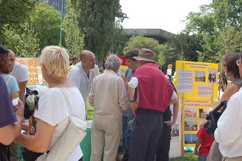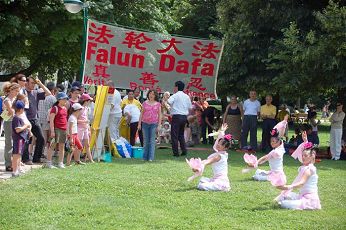 六月三十日是开幕式,法轮功学员向游园者演示了五套功法、传统的中国舞蹈和腰鼓,同时还向人们介绍了这个美好的功法在中国正无辜遭受残酷迫害的情况。