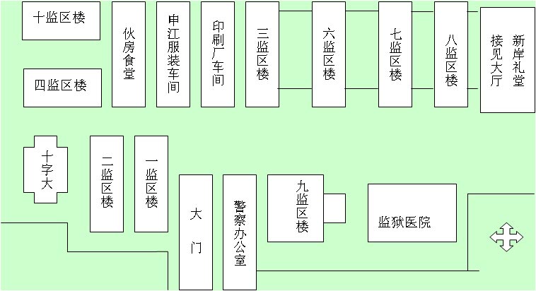 四监区生活区楼是迫害大法弟子的场所,用酷刑“窄凳子”虐待逼迫大法弟子认罪劳动。该楼中囚犯按图中所示虚线走到申江服装厂车间大楼的服装流水线生产出口的劳改产品。在2001年,提篮桥监狱四大队加班加点生产公安人员新制服(华东六省一市的所有警察制服全部由提篮桥监狱生产。当时犯人每天工作15小时以上,大多数犯人休息只能和衣而睡。