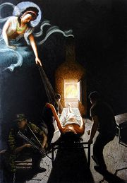 创作说明:画面主体是一位女大法弟子刚刚被解剖,身体的器官已经被摘除,昏迷中要将她投入炼人炉的恐怖场面。这时,一位菩萨赶来迎接这位女弟子,女弟子苏醒过来,痛苦中手伸向菩萨……身边的罪恶的执行者们并不关心人的死活,麻木中继续着罪恶的行为。手握着枪的看守士兵似乎已经完全习惯了这种罪恶,说明着中共邪党用魔性代替人性。