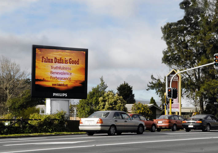 ![]() 近期一个巨幅灯箱广告变换着不同画面:“法轮大法好”、“真、善、忍”的标语以新西兰风景为背景,在奥克兰城市主要街道上将长期矗立在那里,过往的车辆行人一定会感受到从那些画面中散发出的精神力量。 |