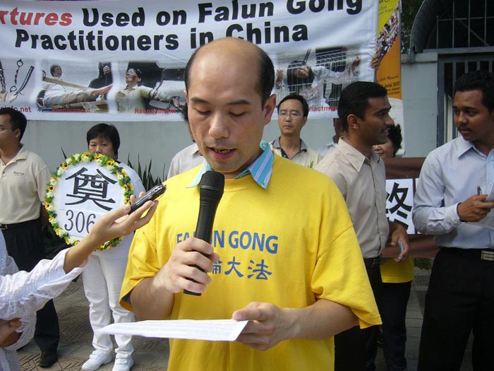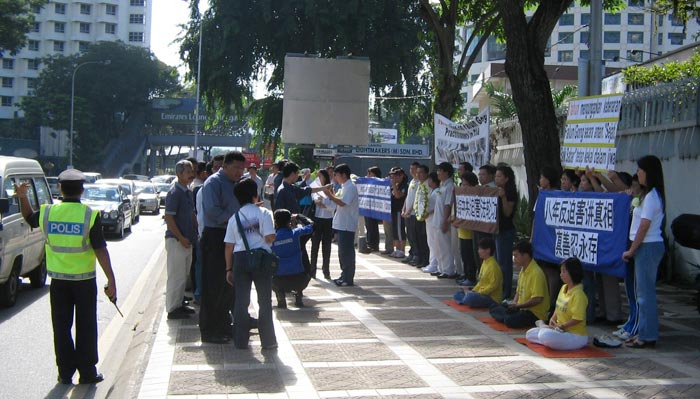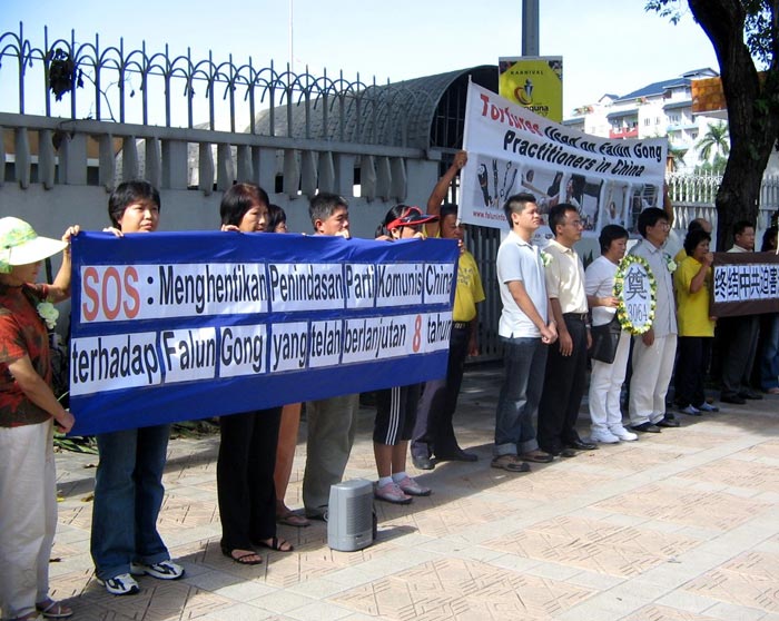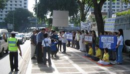 ![]() 法轮功学员在中共驻马大使馆前举行集会,抗议中共迫害 |