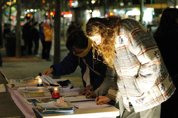 一位名叫Elsie的年轻女孩在市区繁华地段旅店工作,傍晚下班时路过法轮功学员在路边展开的横幅和图片,就停下脚步专注观看,一位学员向她介绍了法轮功是什么,迫害为什么会发生及活摘器官的事实。她听完后表示,这真是太残忍了,迫害和活摘器官必须停止,随后她在法轮功受迫害真相联合调查团的征签表格上写下了自己的名字。