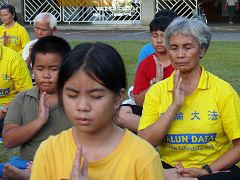 在体育场前炼功的学员,有老有少,法轮功学员林先生说,他的身体原来有多种病症,但在修炼后整个人脱胎换骨;就读小学三年级的玮玮说,他每天早上和妈妈一起到体育场炼功,炼完功后感觉精神特别好,在学校和小朋友相处,他也会记住要真善忍对待同学。玮玮的妈妈则补充说,每天晚上写完功课,他还会上电脑,但不是打电动游戏,而是去跟中国大陆的大朋友聊天讲真相,告诉他们法轮功真的很好,请他们不要听信中共的谎言。布农族原住民高女士也带四个孙子一起来参加集会。
