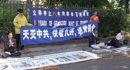 丹麦法轮功学员中使馆前呼吁制止迫害二零零七年七月二十日,在中共对法轮功残酷迫害长达八年之际,部份丹麦法轮功学员聚集在哥本哈根中共驻丹麦大使馆前,强烈谴责中共反人类和种族灭绝罪行,呼吁立即制止迫害法轮功,告诉世人法轮功学员被迫害的真相,制止迫害的延续。