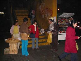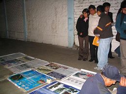 十八日早上八时,法轮功学员来到国立工程大学。该校位于利马市区,正门向着车水马龙熙熙攘攘的大街。大学门口侧面的跨大街天桥,今日成了悬挂“法轮大法好”“真善忍”横幅的最佳场地。学员把真相图片对着大街,挂在大学外的围墙上,图片还未等挂好已经围上一层观看图片的民众。可能出现拥挤的人群引来大学的保安关注,保安告诉学员围墙是属于大学的,悬挂图片需要申请。并告知摆放在地上是自由的。当学员摆放好图片后,发现保安增多了,他们不说话只是看图片和索取传单和报纸。之后,来了一位警察说需要办理申请。学员对警察说,这地方是自由的,我们在这里活动只有一天的时间,主要是告诉人们中共迫害法轮功的真相。警察点头离开去看图片。有的教师仔细看了真相图片后,向学员购买了西文版《九评共产党》一书,表示要彻底的了解中共的邪恶本性。