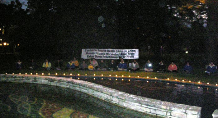 当夜幕渐渐来临时,学员点亮了蜡烛,在花园水池边进行烛光悼念活动,以此追思那些被中共恶党迫害致死的中国大陆法轮功学员。
