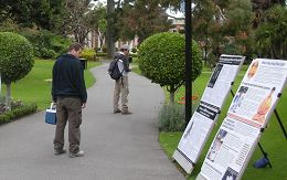 十八日早上八时,法轮功学员来到国立工程大学。该校位于利马市区,正门向着车水马龙熙熙攘攘的大街。大学门口侧面的跨大街天桥,今日成了悬挂“法轮大法好”“真善忍”横幅的最佳场地。学员把真相图片对着大街,挂在大学外的围墙上,图片还未等挂好已经围上一层观看图片的民众。可能出现拥挤的人群引来大学的保安关注,保安告诉学员围墙是属于大学的,悬挂图片需要申请。并告知摆放在地上是自由的。当学员摆放好图片后,发现保安增多了,他们不说话只是看图片和索取传单和报纸。之后,来了一位警察说需要办理申请。学员对警察说,这地方是自由的,我们在这里活动只有一天的时间,主要是告诉人们中共迫害法轮功的真相。警察点头离开去看图片。有的教师仔细看了真相图片后,向学员购买了西文版《九评共产党》一书,表示要彻底的了解中共的邪恶本性。